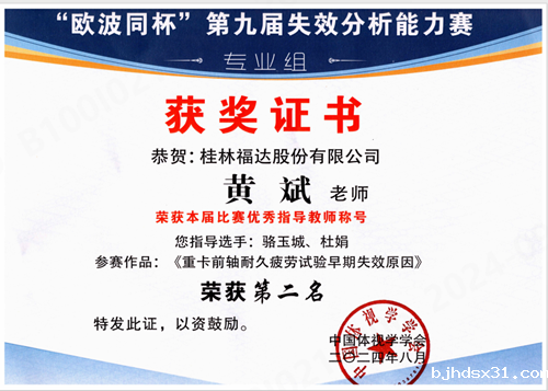 公司参赛选手骆玉城和杜娟撰写的论文《重卡前轴耐久疲劳试验早期失效原因》荣获失效能力分析赛专业组创新赛第二名。同时,公司总工程师黄斌作为骆玉城和杜娟撰写论文的指导教师,在本次大赛中荣获了优秀指导教师称号。